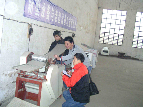 南陽客戶實地考察更換自動疊片燴面機 南陽馬老板在10年前就開始做燴面片批發(fā),最早用的一品鮮Hmj-3型設備,經過10年的辛苦經營,目前每天做面30多...[了解詳情]